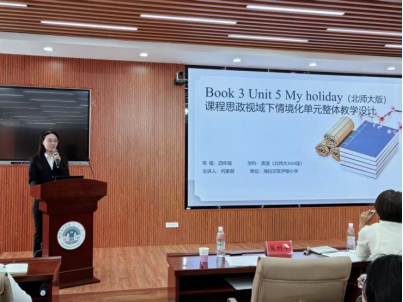 在案例分享环节,伊敏小学英语组组长何家朋老师以北师大版《Book3 Unit5 My holiday》为例,展示了课程思政视域下情境化单元整体教学设计,通过主题引领、思维进阶和多元评价,实现语言能力与文化意识的协同发展。